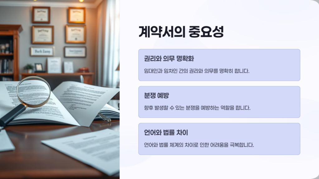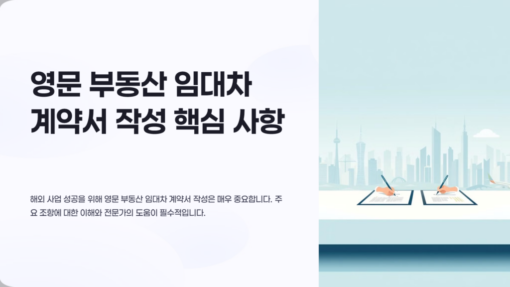 해외 사업 확장이나 투자를 위해 외국에서 부동산을 임대하는 경우가 늘고 있습니다. 이때 가장 중요한 것이 바로 영문 부동산 임대차 계약서입니다. 이 계약서는 임대인과 임차인 간의 권리와 의무를 명확히 하고, 향후 발생할 수 있는 분쟁을 예방하는 중요한 역할을 합니다. 하지만 언어의 차이와 법률 체계의 차이로 인해 많은 기업들이 어려움을 겪고 있습니다. 따라서 영문 부동산 임대차 계약서 작성 시 주의해야 할 핵심 사항들을 알아보겠습니다.