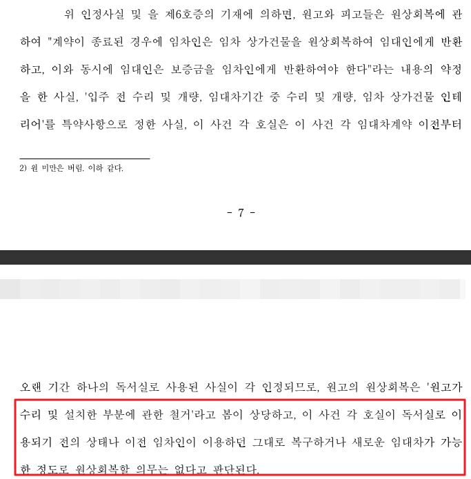 대법원은 오래전부터 “임차인의 원상회복의무는 임차인 스스로 수리하거나 변경한 범위에 한한다”는 법리를 일관되게 유지해 왔습니다. 임차하기 전부터 존재했던 시설, 이전 임차인이 설치한 시설까지 새것으로 되돌릴 의무는 없다는 것입니다.