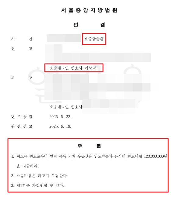 이 사건에서 집주인 측은 답변서도 제대로 제출하지 않고 법정에도 나타나지 않았습니다. 결국 법원은 자백간주 판결을 내렸고, 7개월만에 보증금 1억2천만원 전액 승소 판결이 나왔습니다. 소송비용도 피고가 부담하게 되었구요.