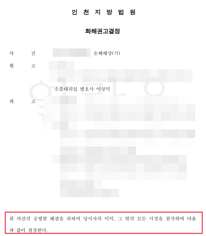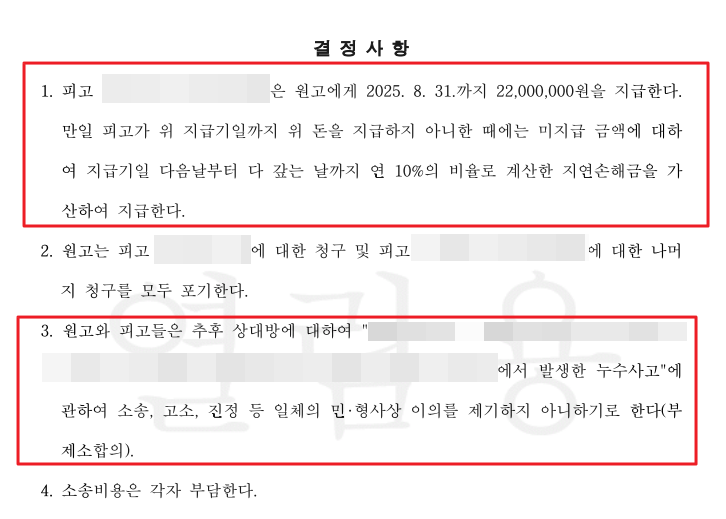 그 결과 재판부는 양측의 주장을 모두 고려하여 화해권고결정을 내렸습니다. 시공사가 이천이백만원을 지급하고, A씨는 윗집에 대한 청구를 포기하며, 향후 이 누수 사고에 관해 민형사상 이의를 제기하지 않기로 하는 내용이었습니다. 청구액 삼천오백만원에서 이천이백만원을 받은 것이 아쉬워 보일 수 있지만, 이는 전략적 선택이었습니다. 1심 판결까지 1년 이상 끌면서 추가 비용과 스트레스를 감수하는 것보다, 6개월 만에 확실한 금액을 받아 즉시 복구 공사에 들어가는 것이 A씨에게 유리했기 때문입니다.